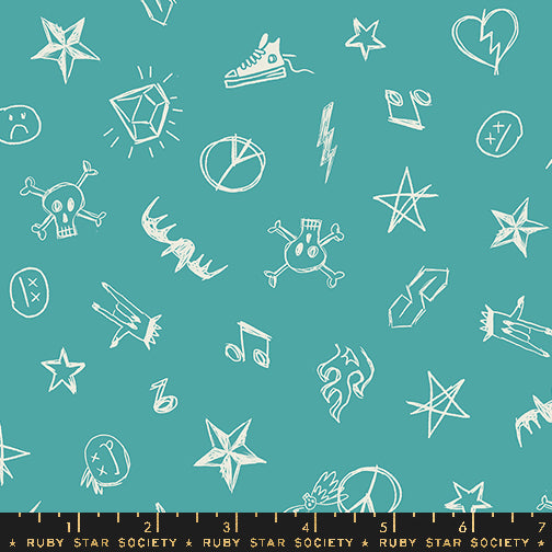 Sarah Watts melded two incredible ideas into one with this incredible collection: a quilty punk rock band and bears. The colors in this one are vey punk rock inspired, with a good amount of black, magenta, turquoise, and gray to help it stand out amongst other Ruby Star collections! And some of the fabric glows in the dark! Sarah also brought back her popular bear print. Â
